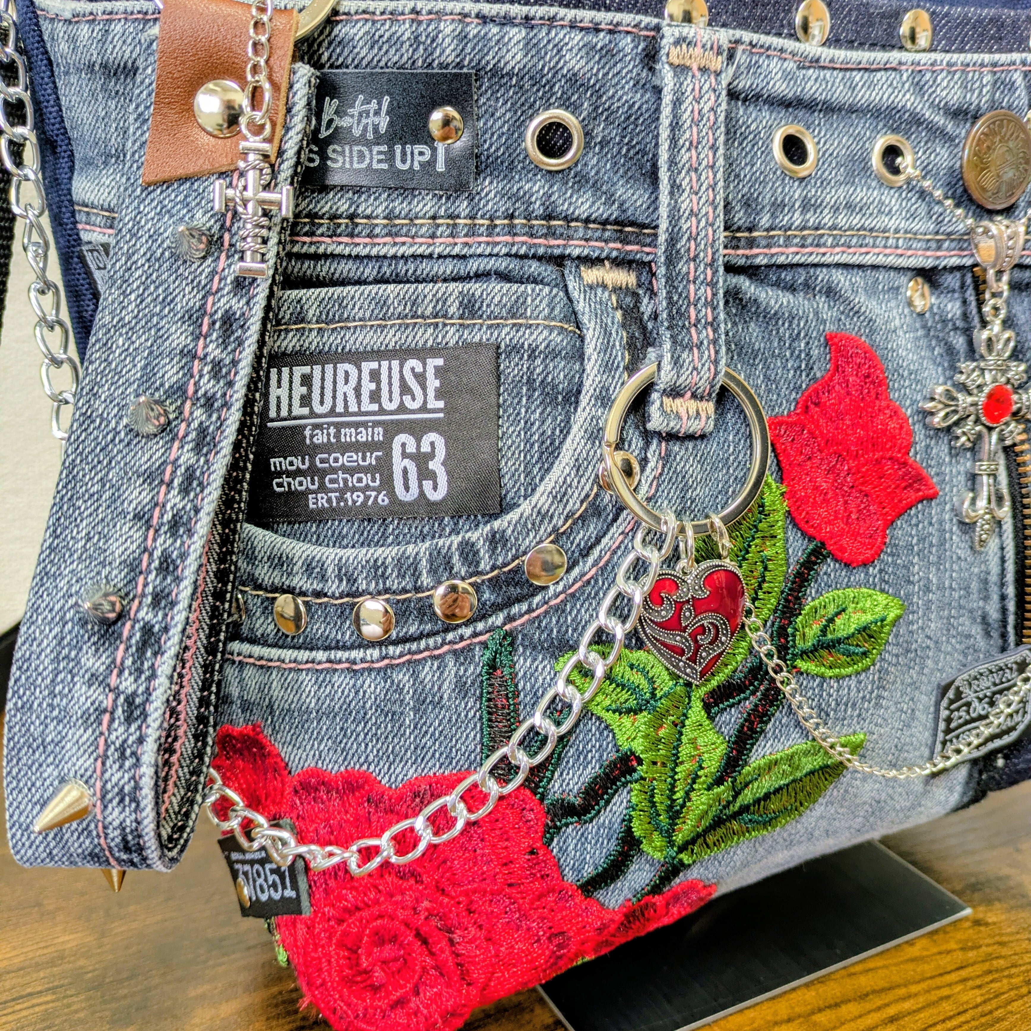 USEDデニムをベースに、ネイビーキャンバスを重ね、薔薇刺繍とスカルモチーフを効かせたフロントデザインです。