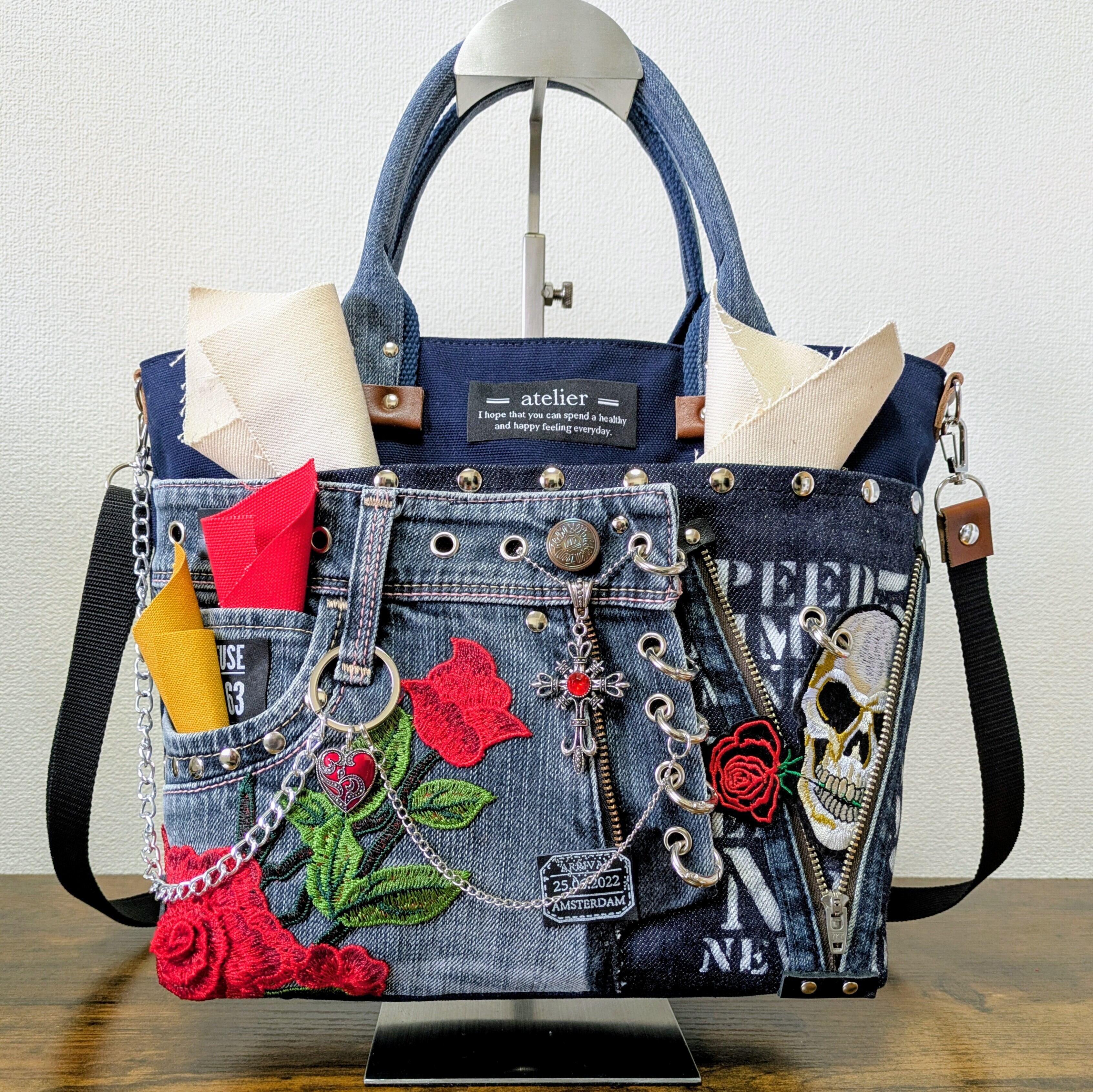 一点物|デニムリメイク 2wayトート|ポケットたくさん・ストラップ・底鋲付き