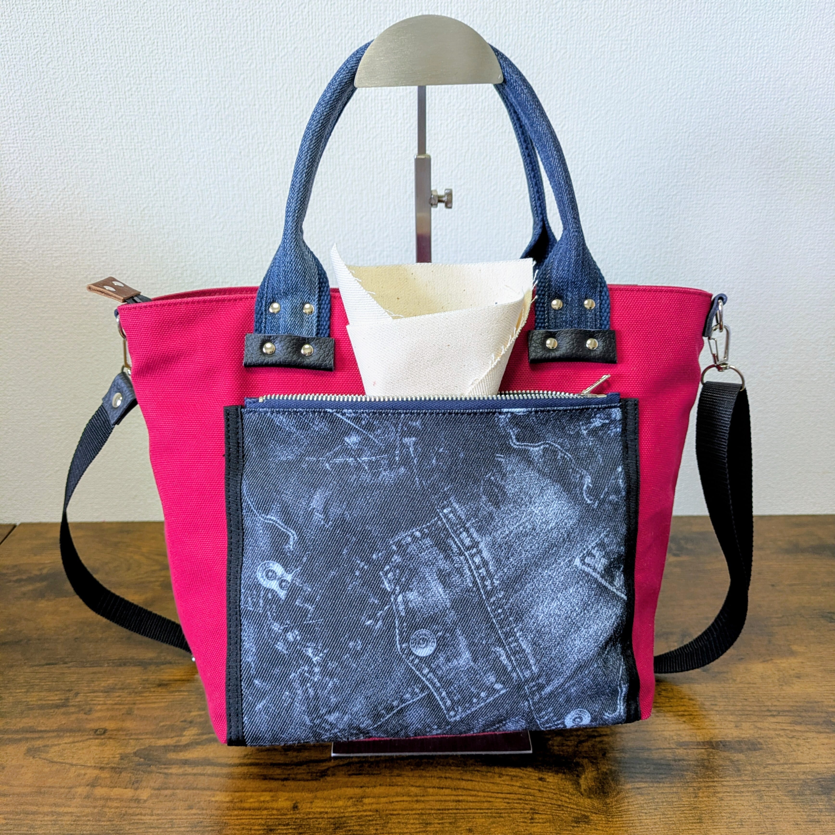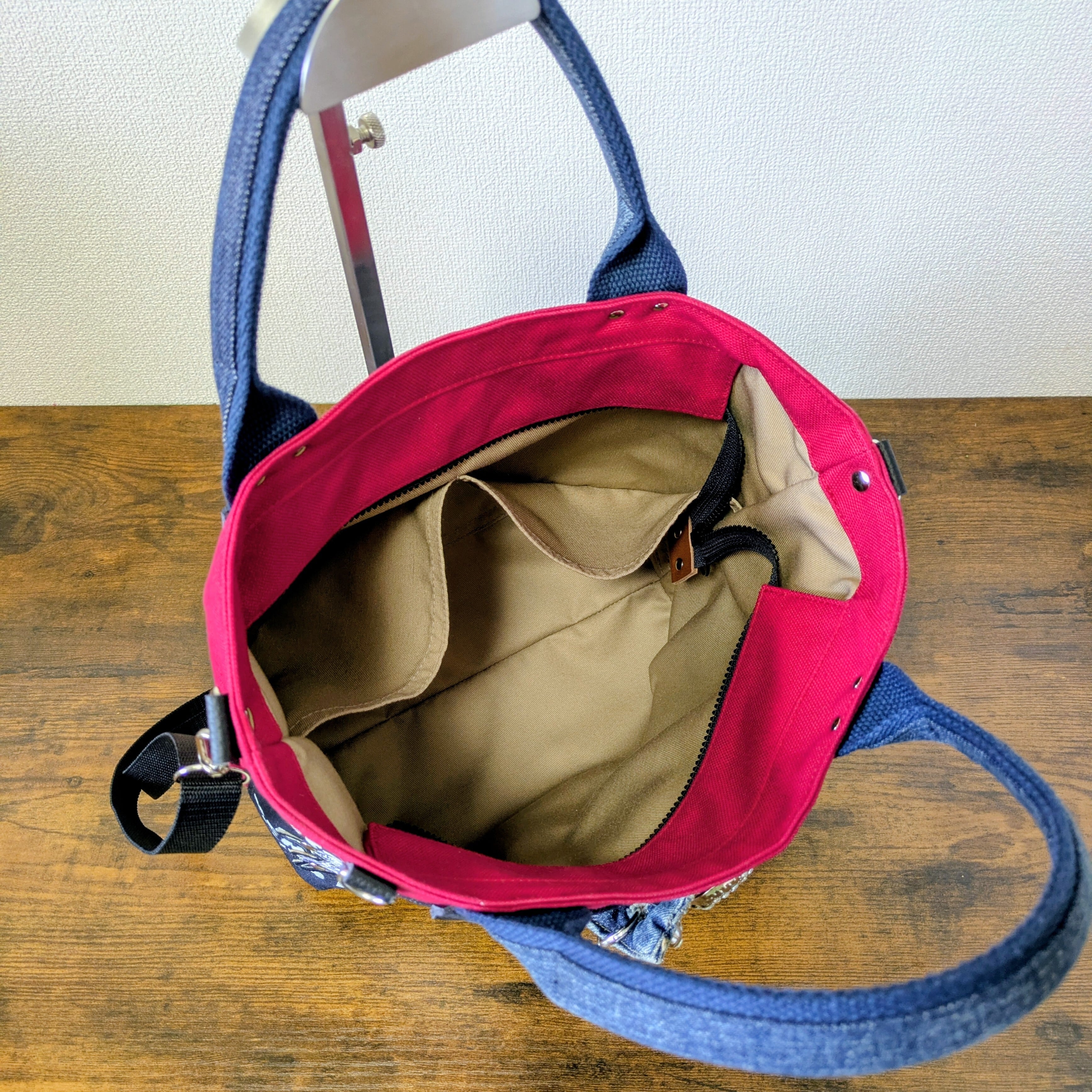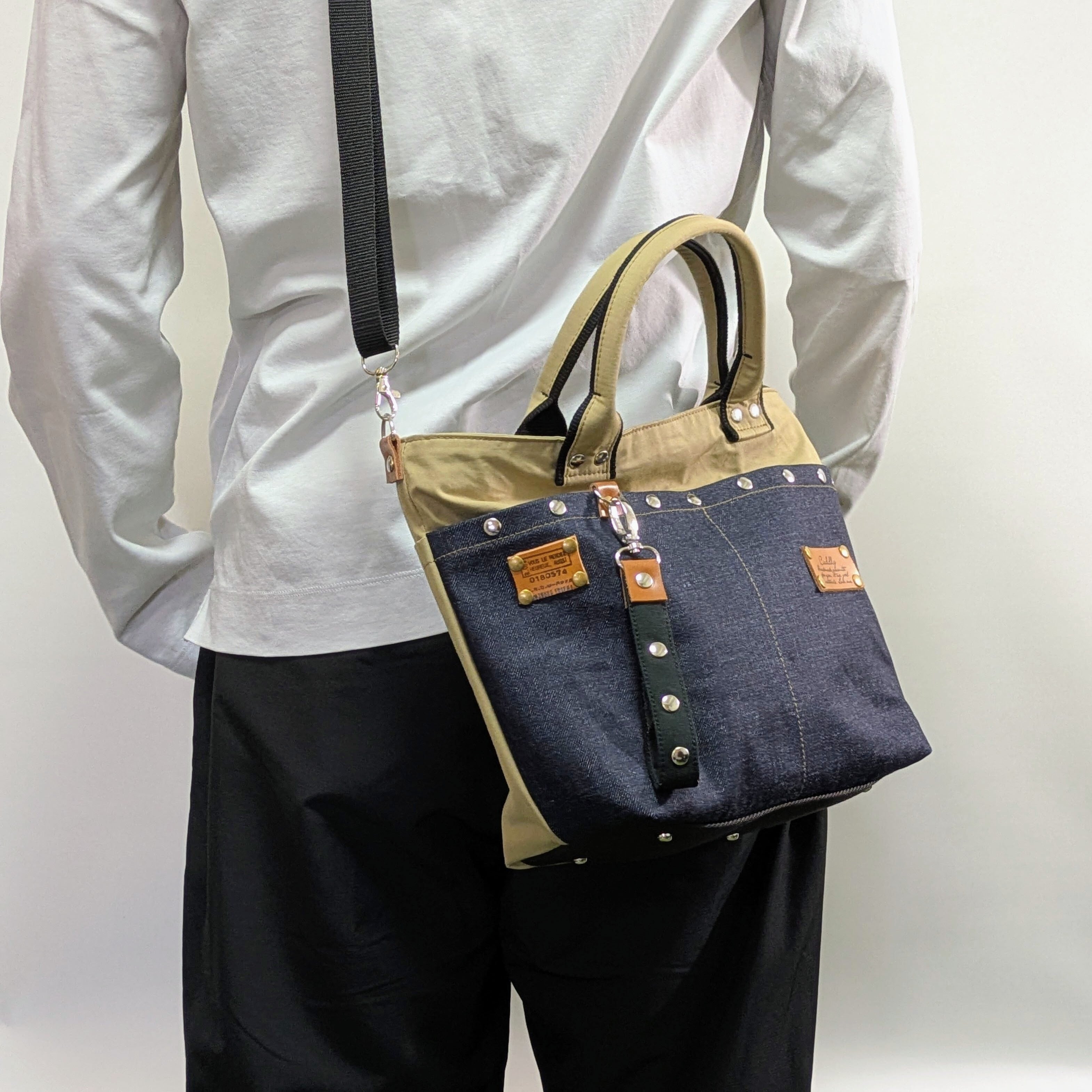 再構築デニム|一点物 2wayトートバッグ|底鋲・多ポケット仕様