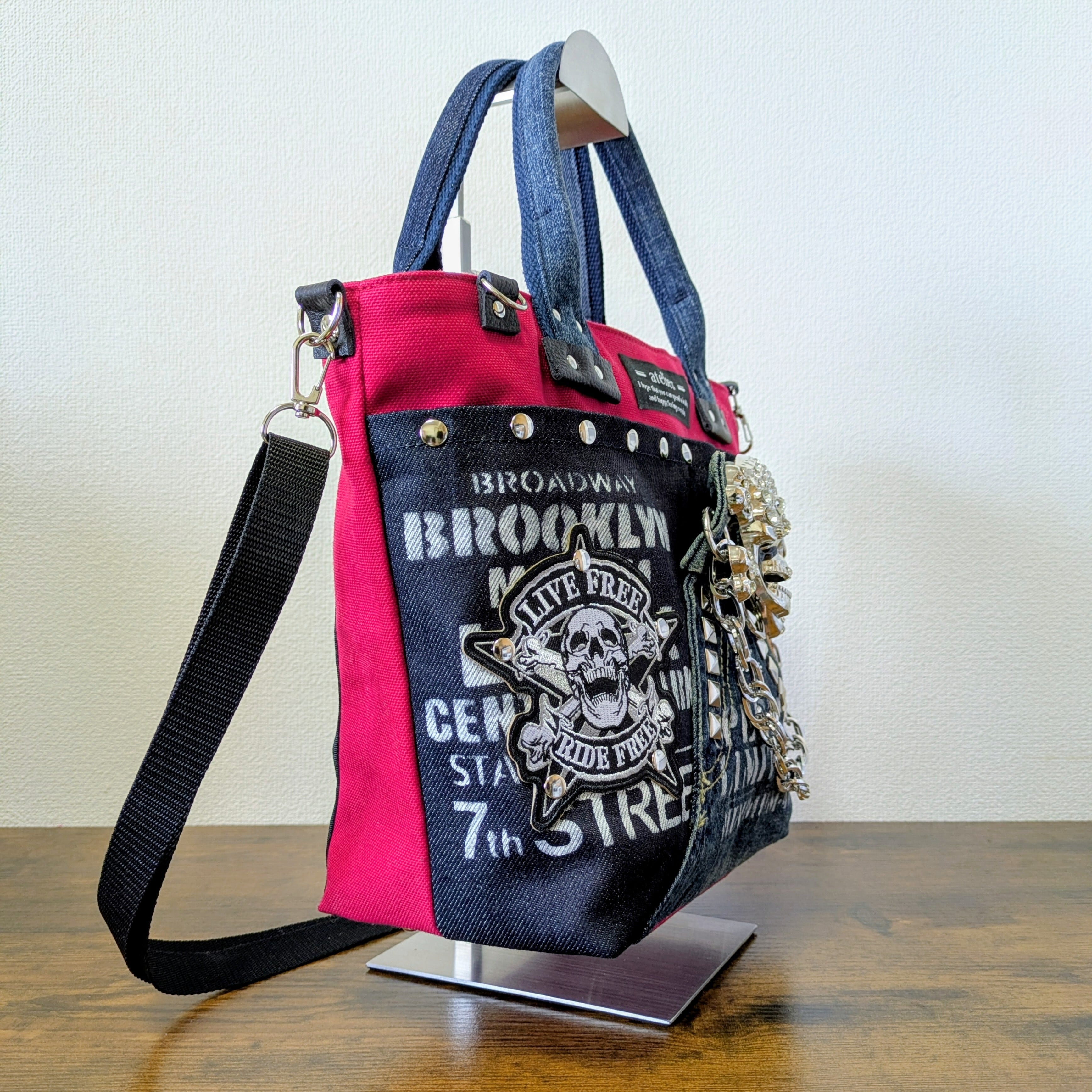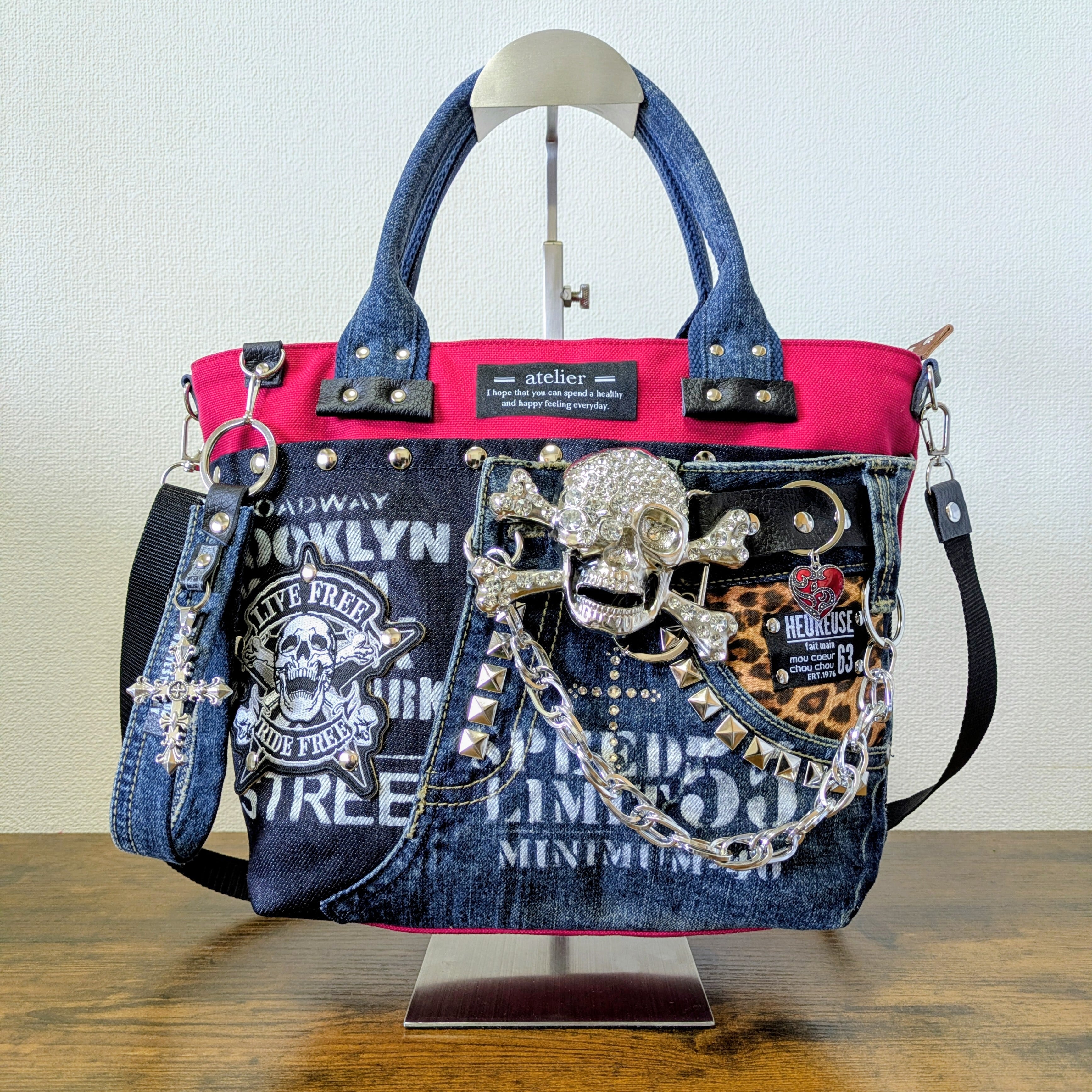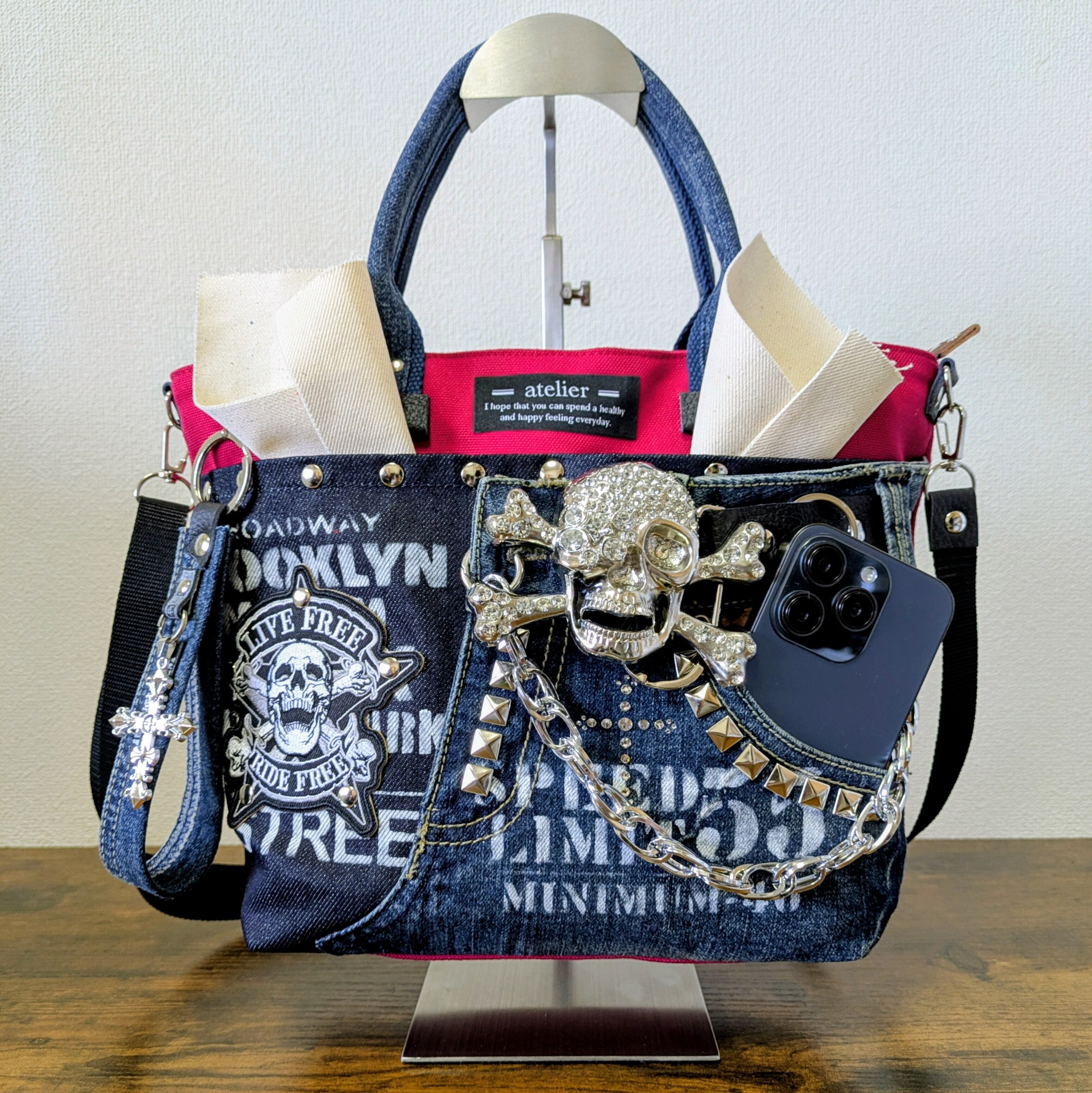 再構築デニム|一点物 2wayトートバッグ|底鋲・多ポケット仕様