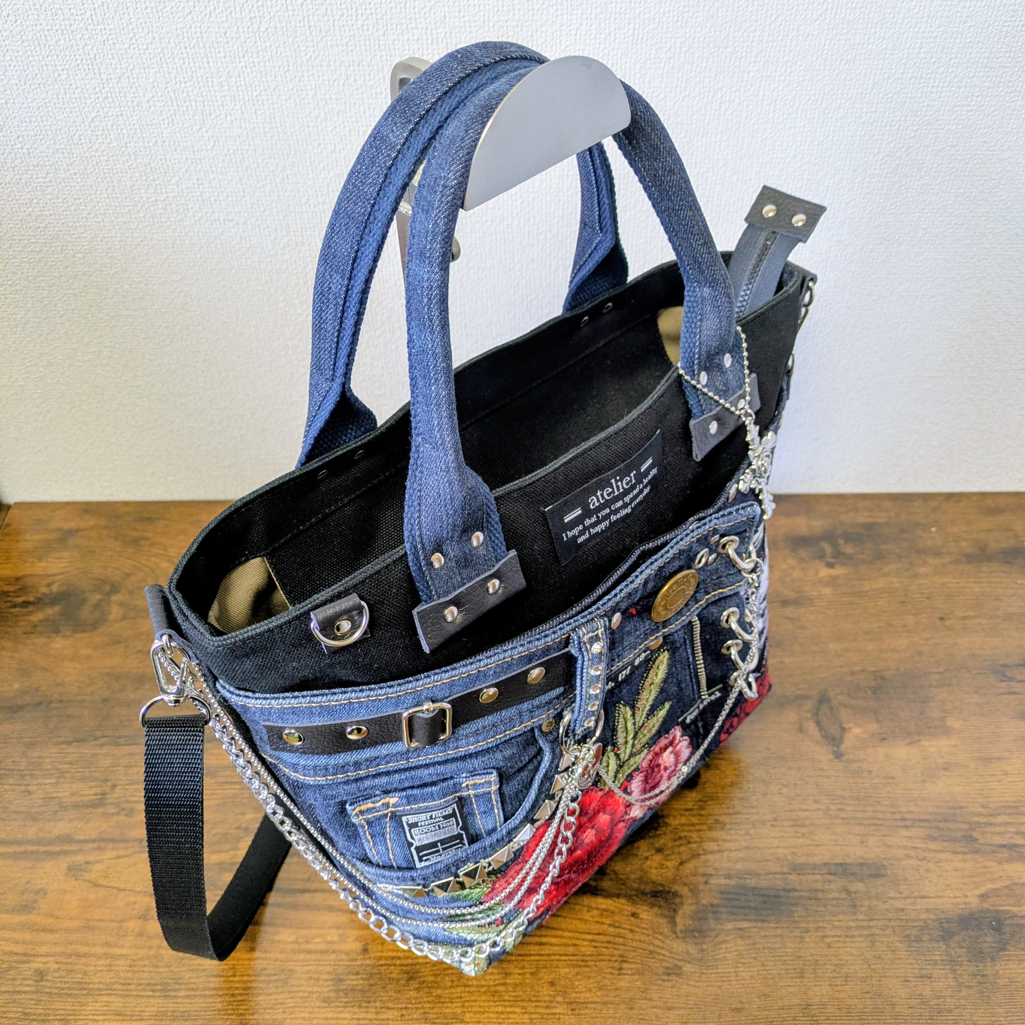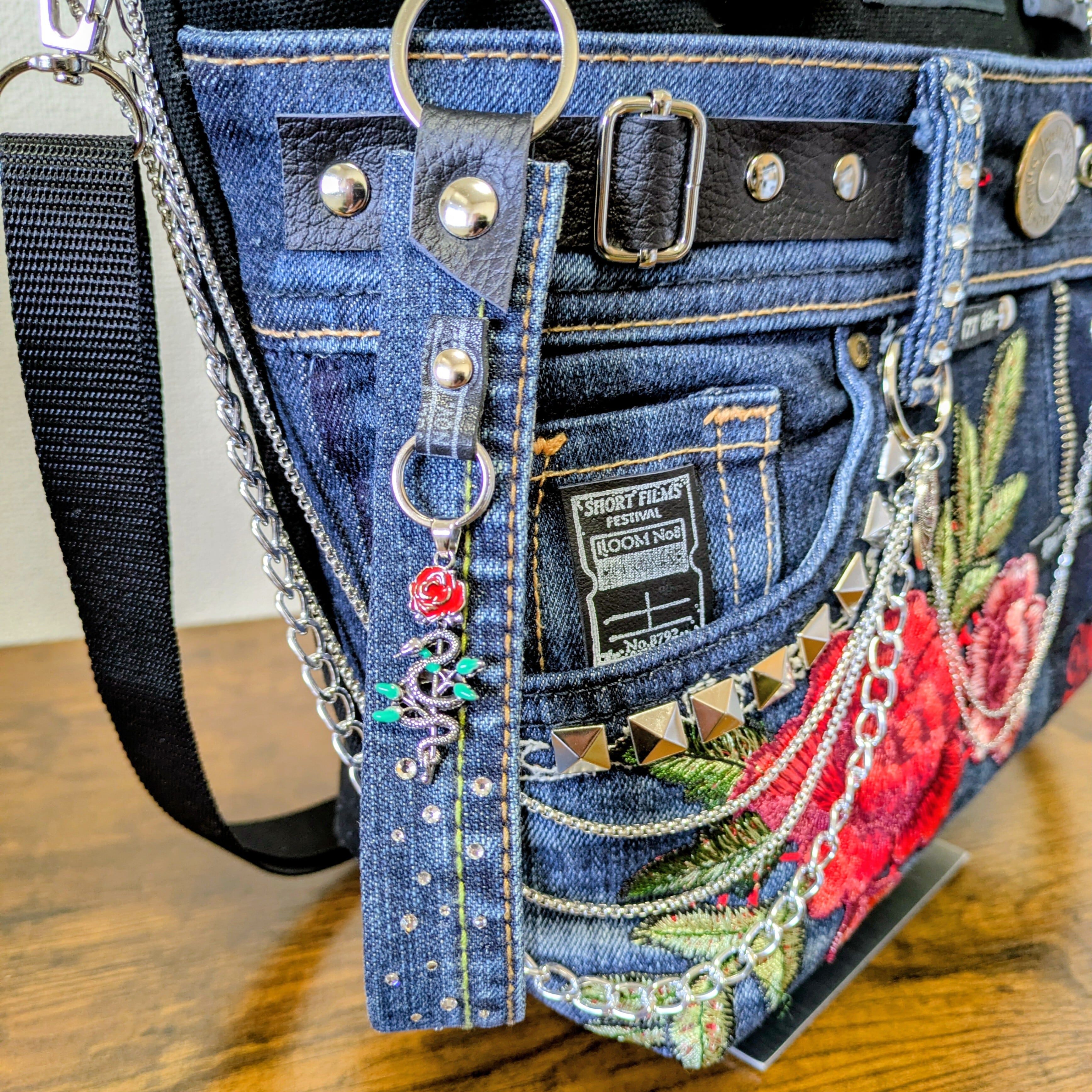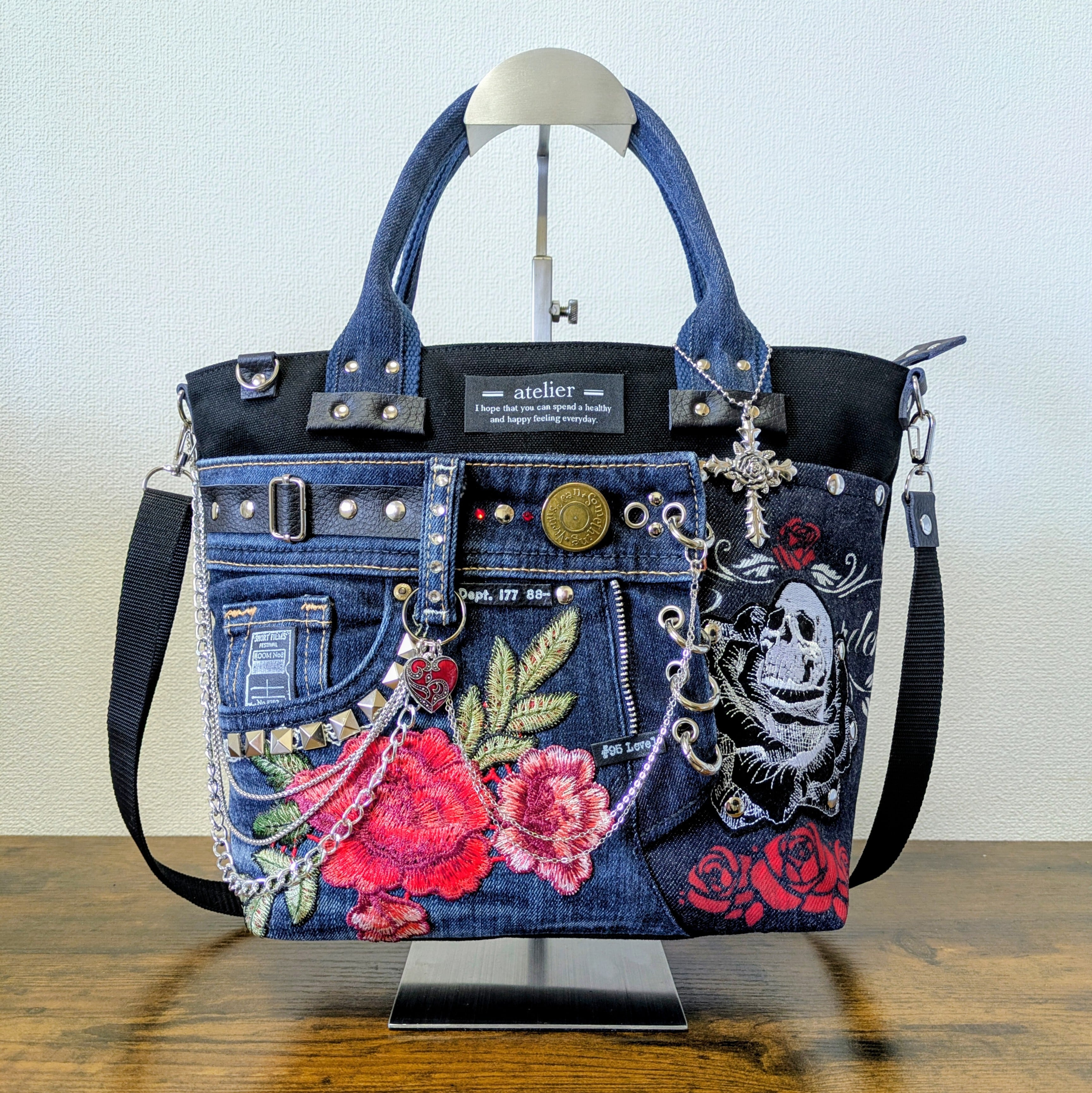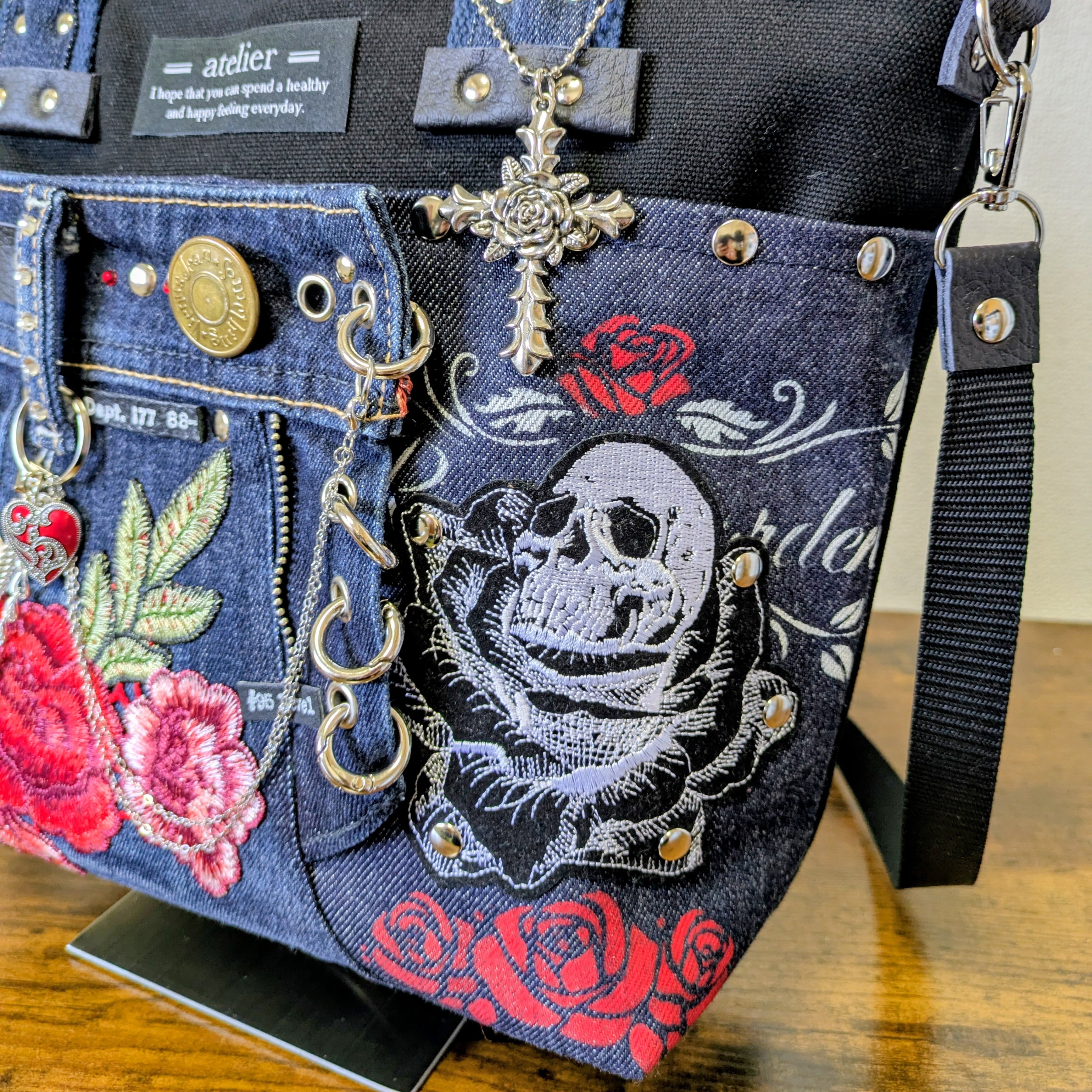 一点物 デニムリメイクバッグ 薔薇刺繍 スカル スタッズ 2way