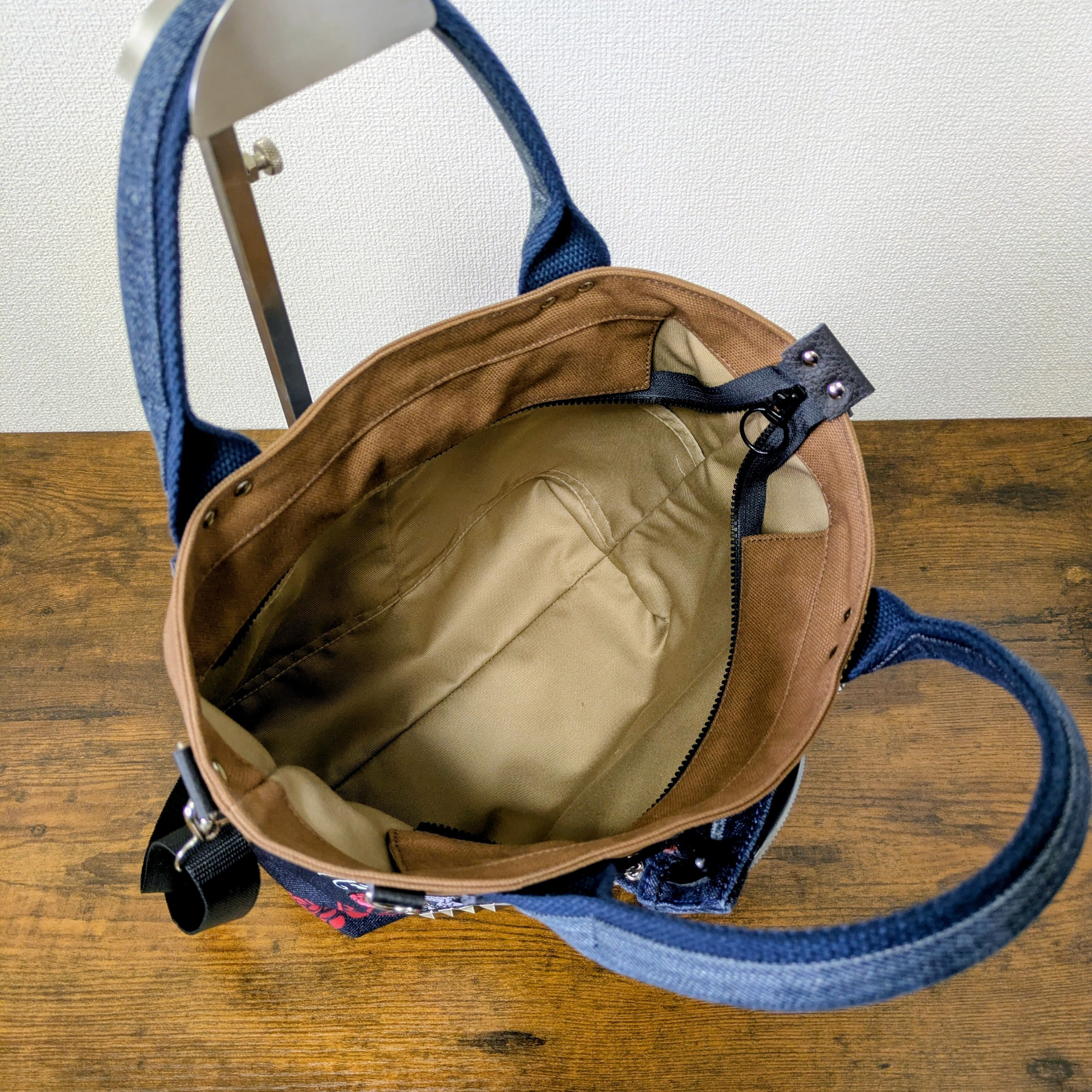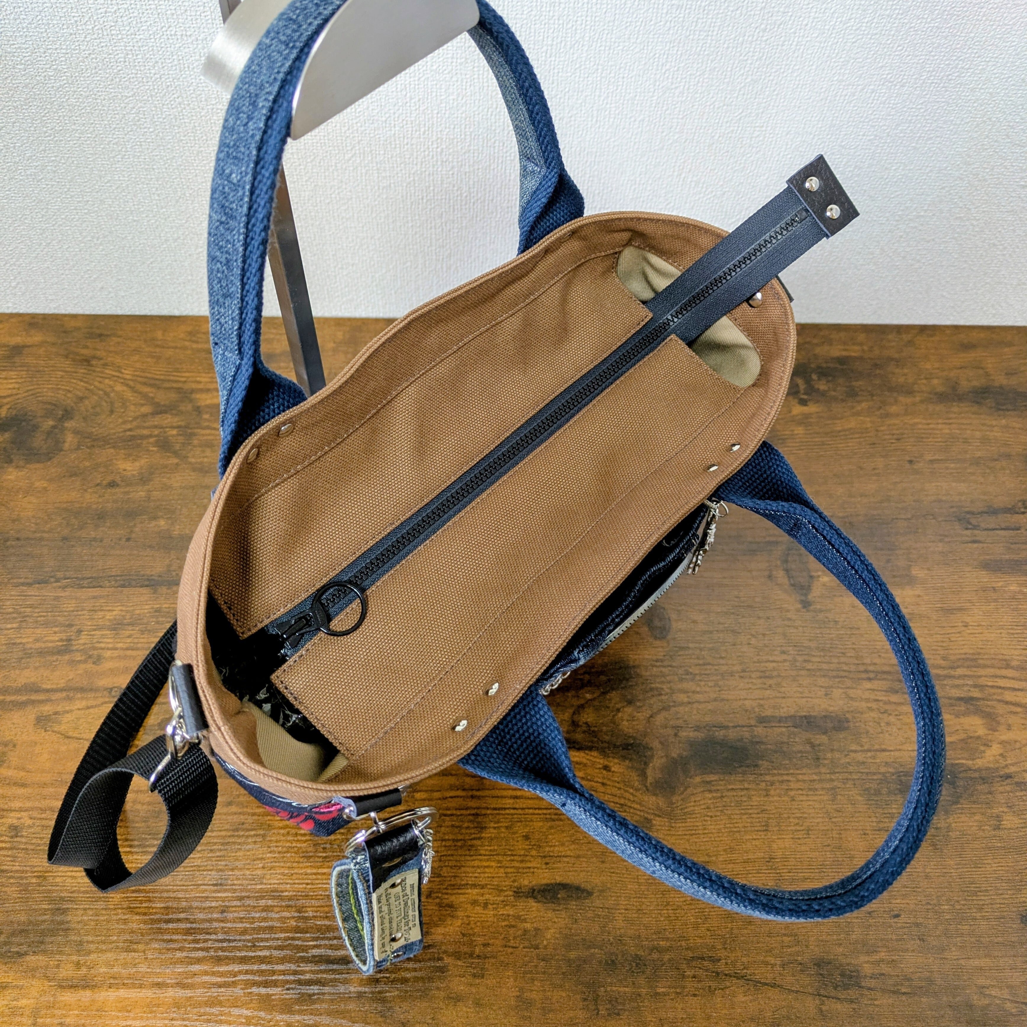 ヴィンテージデニムを解体し、渋みのあるブラウンの帆布と重ねた重厚な一点物です。